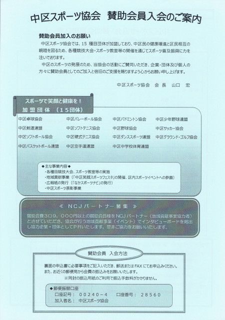 中区スポーツ協会では、賛助会員として当協会の目的である中区のスポーツの普及振興にご協力いただける個人・法人の方を随時募集しています。