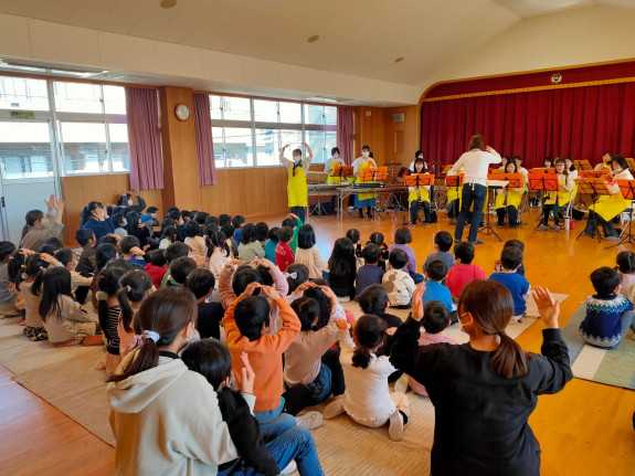 前回大盛り上がりだったお子さんたちは卒園したそうですが、本物の楽器の大きな音を初めて聴く子も多く、興味深そうに楽しそうに聴いてくれてうれしかったです