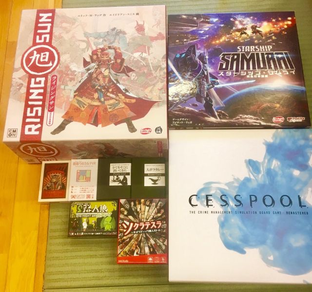 左上の一番箱がでかいやつです。舞台は幻想の戦国日本。固有能力を持った氏族を操り、神々に身を捧げ、時には妖の力を借りながら日本統一を目指すボードゲムです。このゲーム、何と言ってもフィギュアの造形がすごい。細部までこだわっていてそれだけでテンションが上がります。そして完全に政治ゲーです。同盟が可視化されており、自由交渉(お金の受け渡し等)も認められています。さらには裏切りなんてアクションがあったりも。戦のシステムも独特で、人質に取られる前に切腹したり、辞世の句を読んで勝利点を稼いだりします。ただし、各アクションはお金を一番多く積んだ人しかできないため貧乏人は辞世の句すら読ませてもらえないなんてことも。五人でやるとトップの人が同盟からハブられるので、適正人数なんじゃないかと思います。雑に殴り合いながら激シブおマルチをするのが好きな人は是非一緒にやりましょう。