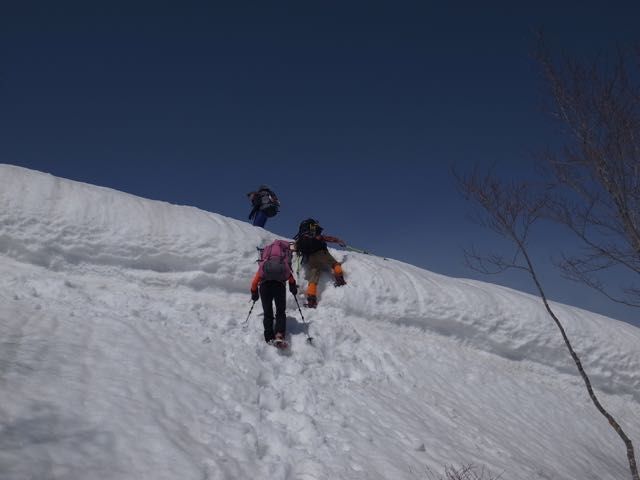 雪庇を乗り越えてからは白山を眺めながらの快適な稜線歩きで、さらに荷物をデポしてからはルンルンの登頂となりました。頂上付近にはスキー場からのバックカントリースキーヤーが次々に来ましたが、稜線を下から歩いてあがったのは数名でした。その中に地元の4名のグループが360度の眺望の中、宴会をされていていろんな話を伺いながら安倍川餅や鍋に入れる肉厚のしいたけまでいただきました。このグループにはその後、下山途中に我々が雪洞をほっている最中に通りがかったおり、「上で焼くのを忘れたから」と手作りの餃子まで頂きました。ありがとうございました。