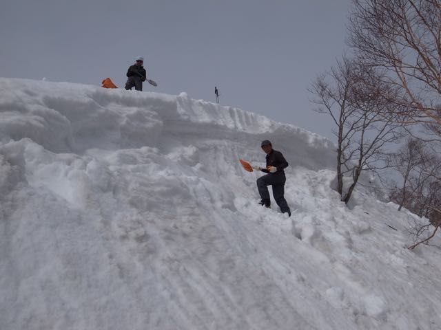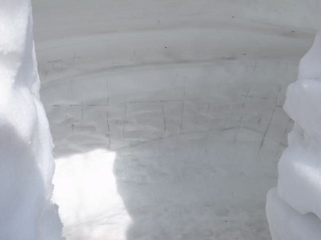 さて頂上から降りてきて本日のメーンイベントの雪洞掘り。「2時間ぐらいかなあ、君が背伸びしても大丈夫なぐらいの大きいやつを掘ったるで」とスタートしたのですが、重くてしまった雪に苦しみ、予想以上の難工事となりました。テントを持っていなかったので途中からは下山も覚悟しながら、大きい穴が時間的に無理そうなのでキツネさんは趣味と実益を兼ねて、堀やすいところにマイ雪洞づくりを開始。スコップ、スノーソウに加えピッケルで削ることまでやり、悪戦苦闘の末、あのスマイル師匠をして「こんなに難儀したことない」という雪洞が4時間かけて無事完成しました。