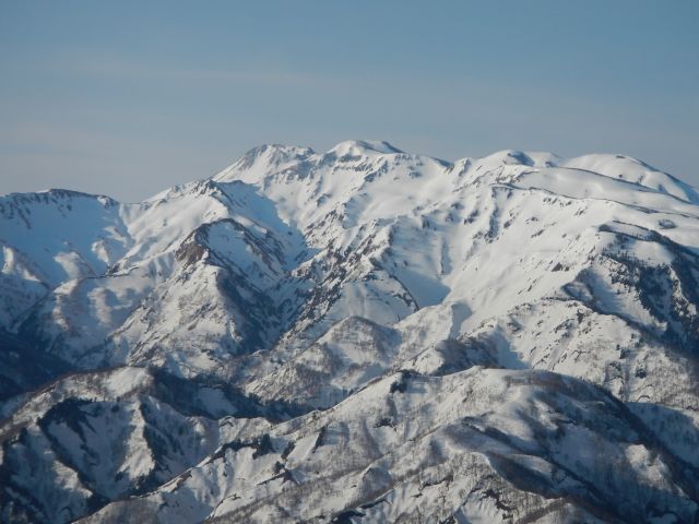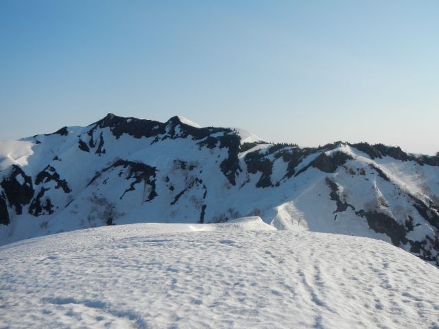 冬瓜(カモウリ)山の北側をトラバースで進んでいくと、先のパーティが主稜線に向かう支尾根の壁に取り付いていました。彼らに追いついてルートについて訊ねると、ここから稜線に上がり稜線伝いに進むのが良いとのこと。そのアドバイスに従い先に稜線へ。快晴{emoji index="1"}で風もなく最高の稜線歩きを楽しむことができました。この写真はシリタカ山からの笈ケ岳(双耳峰の左側、右側は小笈ケ岳)。