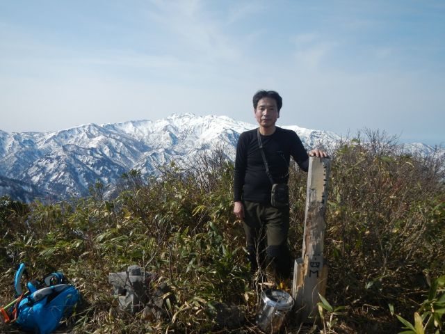 笈ケ岳は、雪がなく藪が茂った意外と小さな山頂でした。登頂した証拠に(スマイルさんと一緒でなかったので)、頂上で一緒になった神戸のパーティの方にシャッターを押してもらいました。