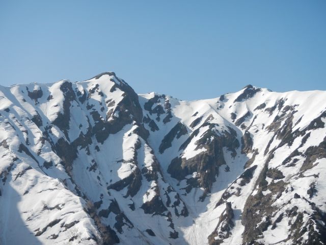 西俣出合までの林道歩きは標高差290mだが平坦で積雪も少なく歩きやすい。ここでデブリ上を通過して北俣本谷を渡り赤岩尾根に取り付きます。