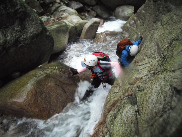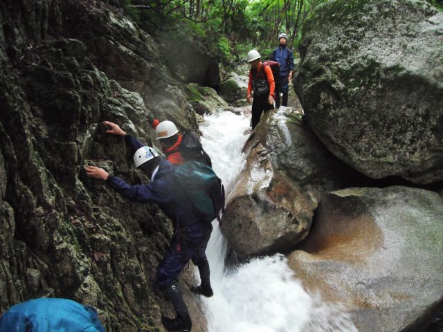 沢登り講習を行いました。昨年は魚止の滝の状態が悪く登らなかったので、私(はむくん)も初めて登りました。とりつきまでの水量の多さにまず一苦労。へつるのか水の中を行くのか、この様子はホームページ掲示板(http://yamanokaifriends.bbs.fc2.com)に動画がアップされております。滝にたどり着くと思っていたよりもすいすいと登れたのですが、最後のほうでちょっと一歩に困るところがありました。まだまだですね。受講生の2人は「ちょっと怖かったけど楽しい」と岩登りではない沢の滝登り初体験を振り返っていました。その後は鎖場をよじ登ったり大摺鉢の小滝をシャワークライミングしたりと小雨交じりで少し肌寒い中、沢登りを存分に楽しみました。