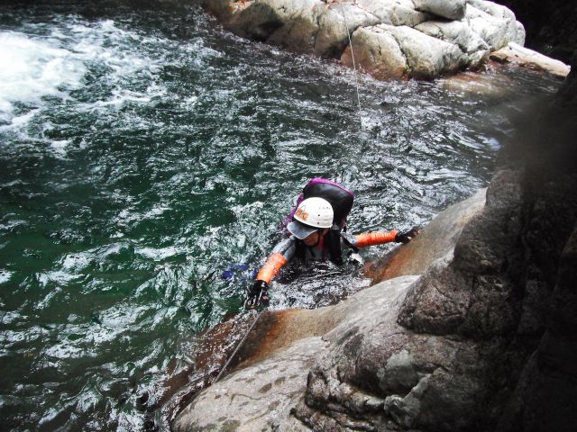 頑張るトリピーさんそして滝の左側に取り付いて無事登ることができました。行く前に「ハーネスいらんのちゃう」との言葉が出るほどで初級の沢と油断していました。こんな滝を登ることになるとは。しかし厳しかったですけどいい経験になりました。