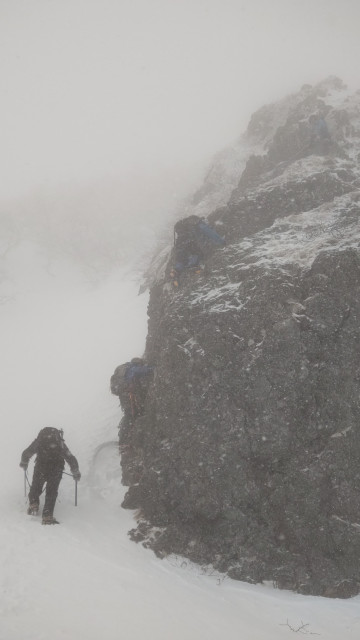 下山:中岳のコルより中岳沢を下山予定であったが、ホワイトアウトしているため安全を期して御小屋尾根より下山。このコース、トレースが消えていたり、一部緊張する岩稜帯もありなかなかの緊張感だった。