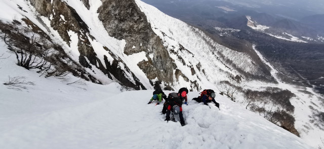 ステップあるとはいえ、雪が腐っていてたまに踏み抜いたり、足を滑らせたら一気に滑落する危険性もあるので気が抜けません。