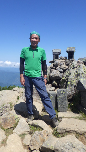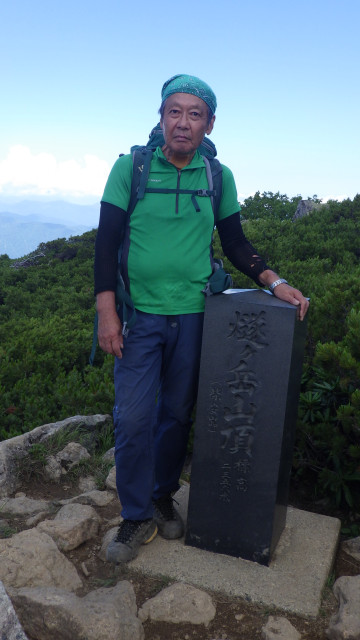 俎グラでの写真は余裕の笑顔をしています。ところが、俎グラ2346ⅿから最高所の柴安グラ2356ⅿまでは30分ですが、この間の下りが険しく、そのせいか柴安グラの頂上での写真は表情がこわばっています。