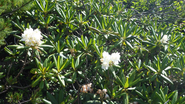 2日目は長英新道を経由して、燧ケ岳に登頂し、尾瀬ヶ原の見晴まで下るコースです。はじめは緩傾斜でところどころぬかるみのある道が続きます。3合目あたりから傾斜が強くなり、高度をどんどんかせぎます。ミノブチ岳あたりまで来ると、尾瀬沼と尾瀬ヶ原の両方が眼下に見下ろせ、行く手には燧ケ岳の俎グラ、柴安グラの2つのピークを見上げて登ります。登山道にはハクサンシャクナゲが咲いていました。