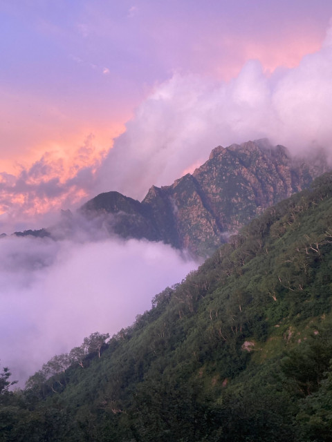 枚方を20時に出て、午前1時頃、馬場島手前で暗闇の中ソロのトレラン2名を見かける。何処まで目指すのか!一時半時点で駐車場は満杯。第二駐車場で明日に備えてプチ宴会。快晴の朝を迎え小屋までの標高差1500mの急登に心が引き締まる。100m毎の親切な標高表示があるが、次の標高表示までの長い事😰オブジェの様な立山杉にパワーを貰い、滴る汗で熱中症予防に塩飴・梅干しを食べ標高上げるにつれて、左手に大きな赤谷山が目に付く様に成ると、まもなく早月小屋だった。何とか到着安堵した瞬間😅此処からは小窓尾根が間近絶景でした。ガスで見え隠れする残り800mの急峻な尾根を望みながら、ご褒美のビール(350ml→800円)買い求め乾杯、ヒボーさんは担ぎ上げたが冷えて居ないので買いました。本当に力強い‼️この時期雷雨覚悟が雷鳴が遠くで聞こえただけで済む。翌朝、満点の星空に浮かぶ富山の街明かりと小窓尾根のシュリエットを望みながら、前日以上の急登をこなし360度の展望にやった感に大満足。早月尾根、日帰りの人が結構いました。さて登山口まで標高差2240m、ビザを痛めない様にヒボーさんの気遣 いでストックを貸して頂いたお陰で軽い筋肉痛で済みました。