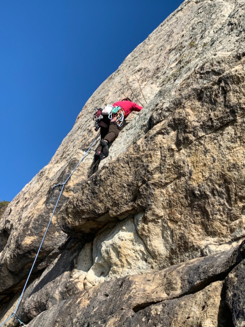 快晴のお天気のなか、紺碧の青空の中を登る。クライミングしていて良かったと思う瞬間。