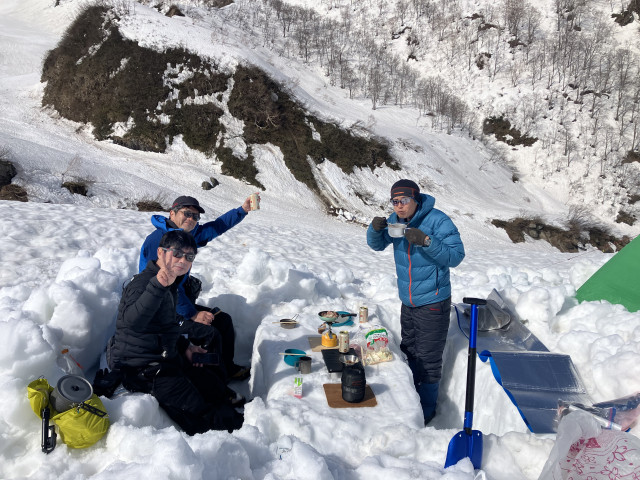 白馬尻に到着後、テント設営。立派なテーブルとベンチを作ってもらい、宴会開始。