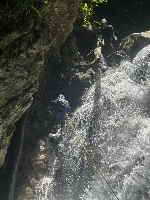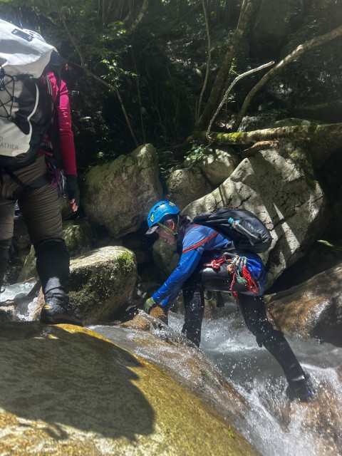 魚止めの滝では、おーさんがリードし、その後講習生さんたちがタイブロックにて登攀しました。皆さん問題無く登られていました。