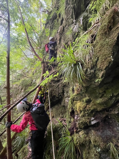 巻きルートが本にも「泥壁」と表現されていた通り、ヌルヌル急斜面の難ルート。ここをリードで行っていただいた おーさん すごいなぁと思いました。さらに、晴れていた天候が雲が多くなり、遠くからゴロゴロと雷の音まで…。暗雲垂れ込めましたがなんとかみんな無事に登りきることができました。