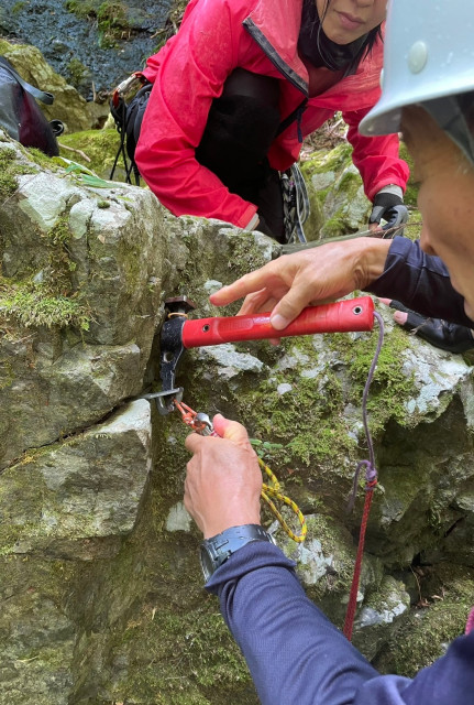 さらに進むと しずくの滝 と そこに隣接する18m滝が現れます。一度ここで休憩。その間にスマイルさんよりハーケン実地講習があり、みんなで実際にハーケンを打ったり、抜いたりと良い経験を積むことが出来ました!