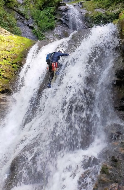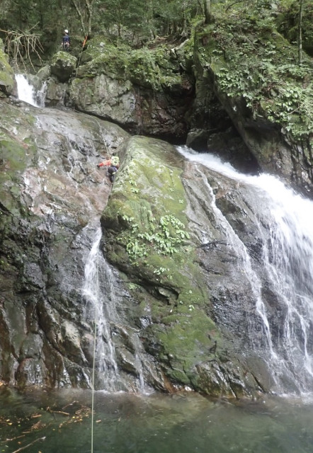 第1ゴルジュ突入。入口5mに左背後の支流40mが連なる姿は大迫力で圧巻。水量少ない為か水流右階段状を登れそうな好印象。ロープ装着しリードで登攀開始。壁面は緑苔がビッシリ生えているが人口芝的な感触で滑りなくフリクション良好。下段は階段状を気持ち良くシャワークライミング。中段で階段が途切れるが右へ移動して再び階段状を気持ち良くシャワークライミングし完登。支点になるような物が何もなく唯一ハーケン打てそうなクラックあり。さっそくモリクロハーケンを打込み、カラビナでロープを固定。sakiさんはタイブロック、スマイルさんはビレイで完登。(所用35分)