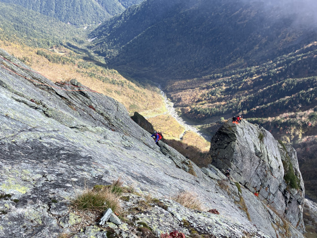 一応ロープを出し、左に巻きながら1pで登ると4尾根の取付に到着。5尾根から来たパーティと先行のガイドパーティがいてここで少し順番待ち。