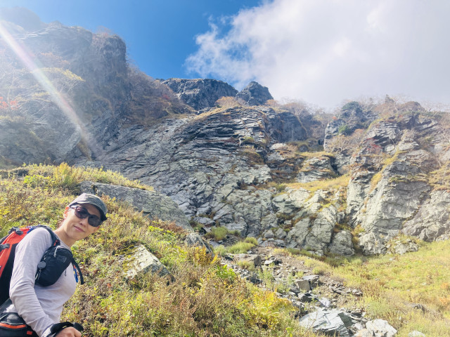 5:20頃1p目登攀開始。3pでBガリー大滝終了点へ。ロープをまとめ、左の草付きから歩いてCガリーを渡りヒドンスラブへ到着。