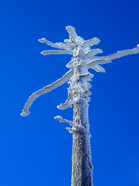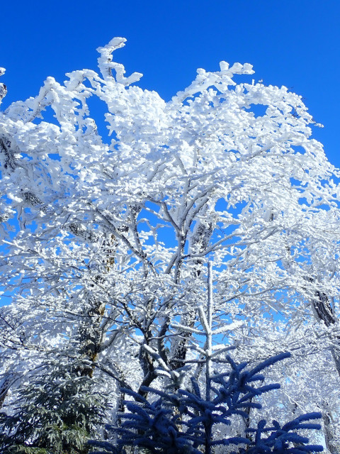 カナビキ尾根分岐付近ではチラホラと樹氷が見られ、さらなる高みに胸を踊らせながらナベの耳、高橋横手へ、日裏山付近からは素敵な樹氷のお出迎え、細尾山を過ぎてからは陽もさし始め素敵な樹氷を景観することができました。