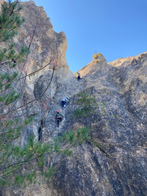 到着後、アイゼンクライミングチームはクライミング場へ。アイゼンワークチームはシュリンゲ簡易ハーネス アイゼン ピッケル ヘルメット装着し隆起する岩場へ。当初は僅かにある砂地をクルクル回ってアイゼンでの脚慣らしをする位だと思っていましたので、ザクザクと脆い感じやカチカチ岩肌の急斜面を登りだした時には雪の感覚に似ているなぁ、これは本当に良い訓練になるなぁと思いました。