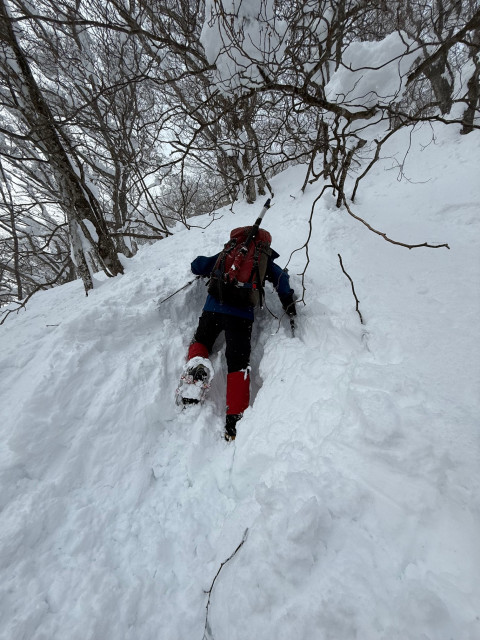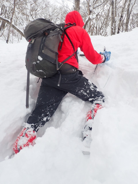 ワカンはよく携行していますが、ヘタレの私は実際に使うことはほとんどなくラッセルなんて何年ぶりなんでしょうか。2人しかいないので順番もすぐに回ってきますし、大変です。傾斜の緩いところは花魁歩きで踏み出す足を後ろに抜いて外に回してズボッズボッと、きつくて息がすぐに上がります。だけどまだいいんです。一歩一歩ゆっくりでも前に進みますから。急斜面になるといけません。目の前の雪を崩して膝で固めてそこに踏み込んで・・・下手な私は踏み込もうと思ったら後ろ足が崩れてしまって踏み込めず、なんか同じ場所でバタバタしているだけで自分でも笑ってしまいます。