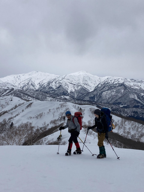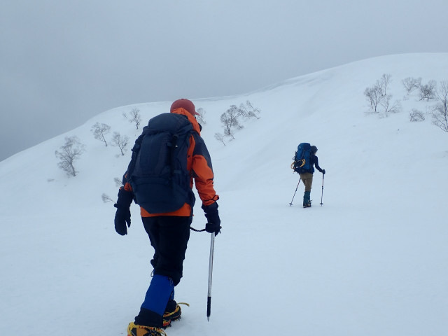 当日天候終日ほぼ無風、午前曇り午後ぼたん雪。気温体感温度共に適温で暑くなく寒くなく曇天ながら見晴らしはよく良い日和だなぁっと話しながら、午後にはしんしんと雪の舞う善い山行となりました。