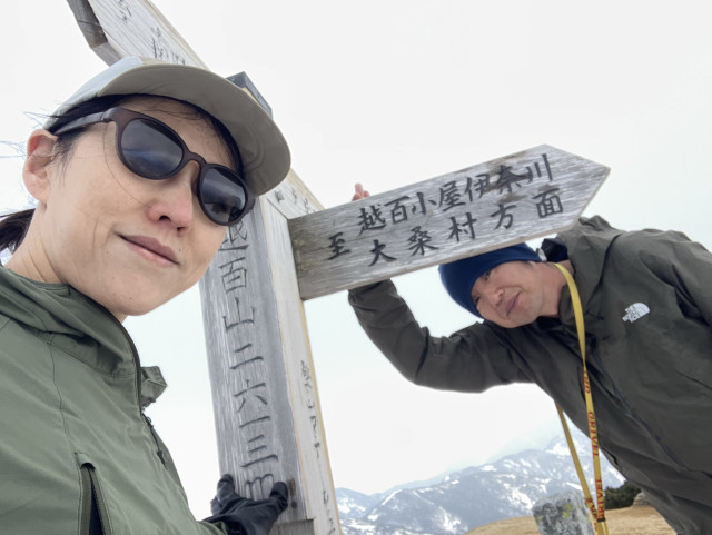 越百山に登頂するも、風が強く写真だけ撮ってすぐに下山。
