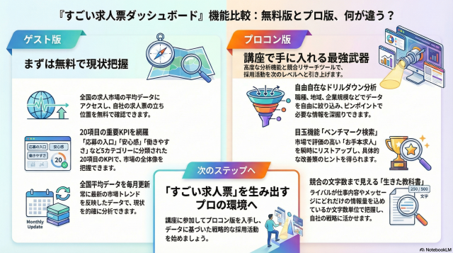 平均値を知るだけでは不十分です。「勝つ」ための具体的な戦略を立てるには、より強力なツールが必要です。そこでご案内するのが、「 すごい求人票ダッシュボード(会員限定プロコン版) 」です。この高度な分析ツールは、「 すごい求人票コンサルタント講座 」の参加者に提供されます。プロコン版が持つ強力な機能をご紹介します。