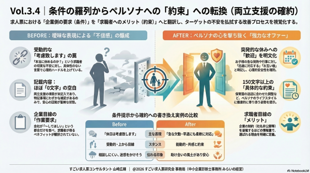 「休日は考慮します」といった曖昧な条件の羅列では、子育て世代の不安は消えません。ターゲットペルソナが本当に求めているのは、時給の高さではなく「生活との両立のしやすさ」と「安心感」です。