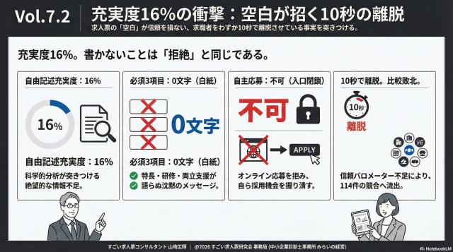 本日は、AI求人票ドクターが弾き出した「充実度約16%」という残酷なデータから、最初の10秒で足切りされる理由を紐解きます。 「会社の特長」「研修制度」「両立支援」といった項目が0文字(白紙)であり、オンライン応募も不可。現代の求職者にとって情報の空白は「教育体制がない」「休みが取れない」という最悪のシナリオを生み出します。