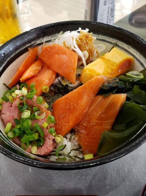写真はゴルフ場で食べたサーモンマグロ丼です