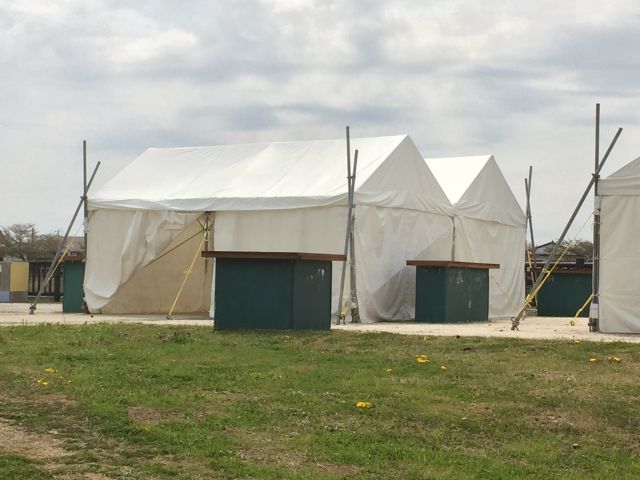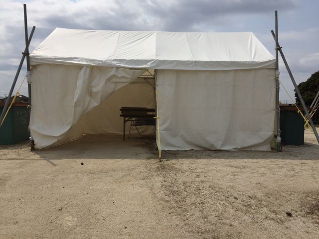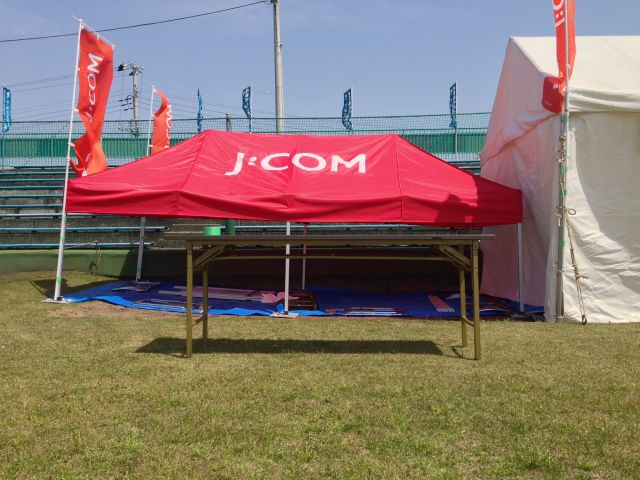 まずは、J:COM茨城様です。今回は野球場が工事中のために、テント設置には、様々な調整が必要でした。また、毎年の教訓を考慮して今回は、ブースサポートを利用される方が、雨でも大丈夫なように、写真にあるようなテントを設営してくださいました。更衣室、受付、荷物置場はこの2つのテントで運営させて頂きます。