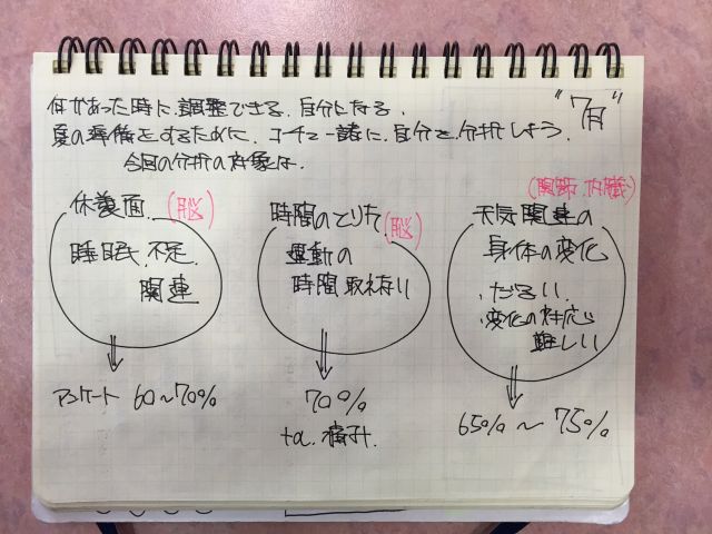大きく分けて、休養面では睡眠不足、練習の時間の取りかた、天気関連の身体の変化(だるい、変化の対応がむずかしい)という 3つの分野で、現在のマラソン教室に参加されている方は、持っている課題です。