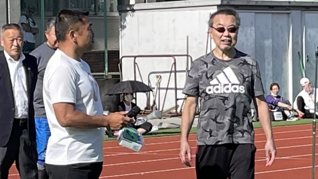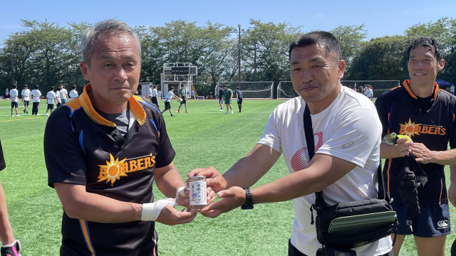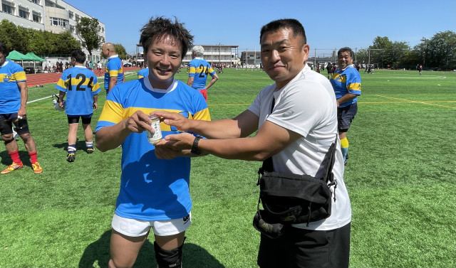 高校生の前で、取ったり取られたりのシーソーゲームを展開。おじさんになってもラグビーをできることをお披露目しました。