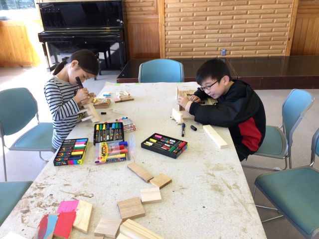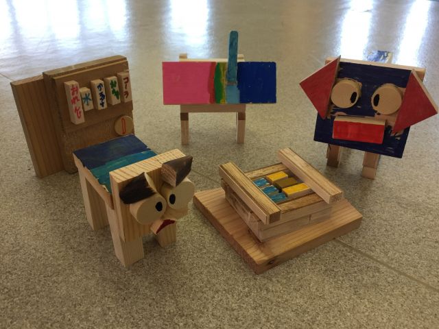 山積みにされた木片を自由に組み合わせて、エンチョーさんがホットボンドで接着してくれました。それに色マジックで色付けして、思い思いの作品を完成させました。