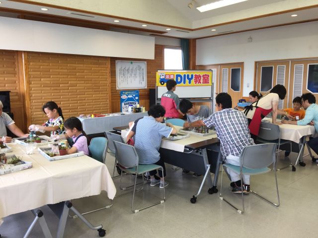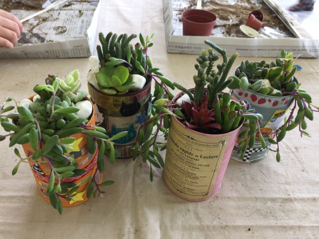 今回はペンキ缶にあらかじめ塗装して準備してくださった物に各自シールなどでオリジナルの鉢にリメイクする事から始まりました。シンプルに飾る子、貼る場所がなくなるほど派手に飾る子、さまざまでしたが貼り方ひとつでずいぶん雰囲気が変わるんですね~。親も子も夢中でした!