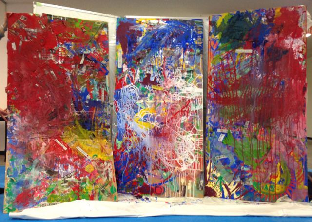 9階ではピアノアンサンブルチェリッシュさんのエレクトーンの音色と一緒に、ペタペタ。筆、刷毛、ローラー、スポンジ、タンポなど色々な道具を使い、新聞の見出しや広告の上に描いてます。