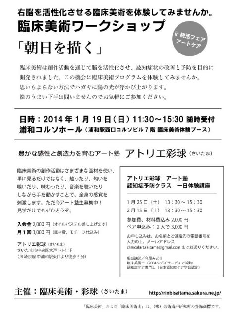 臨床美術・彩球としては、認知症予防としてのアート、リハビリとしてのアート、最期まで自分らしい表現を楽しむためのアート、を提案したいと思います。そろそろ”終活”が気になる方もそうでない方も、フェアを楽しみたい方はどうぞお立ち寄りくださいませ。