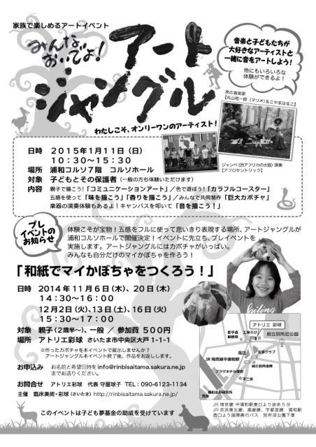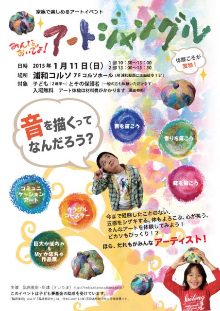 来年1月11日に浦和駅前のコルソホールを借り切って、彩球主催のアートイベントを開催する運びとなりました。感じたことを思いきり表現する場所、名付けて『アートジャングル』!