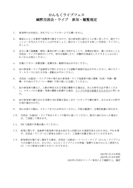 13.参加規定を繰り返し違反する場合、交流会(お話会)・イベント・ライブ(かんもくライブフェスが主催するもの、ならびに、かんもくライブフェスが共催・協賛する他のかんもく団体のもの)へのご参加をお断りさせていただきます。