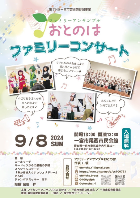 「ファミリーアンサンブルおとのは」は、愛知県一宮市を拠点に、子育て中のママさんが中心となって活動するファミリー吹奏楽団です。