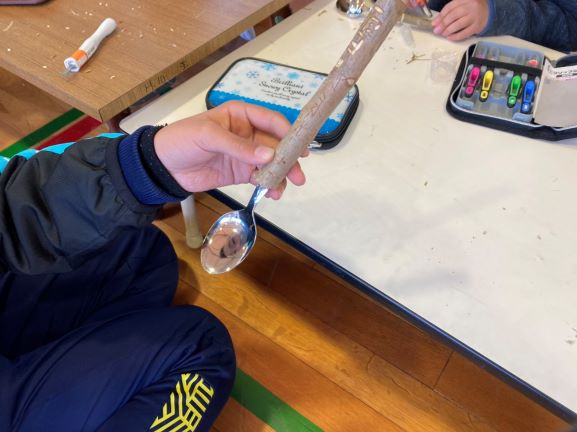 スプーン作り。彫刻刀で好きな文字やマークを掘りました。