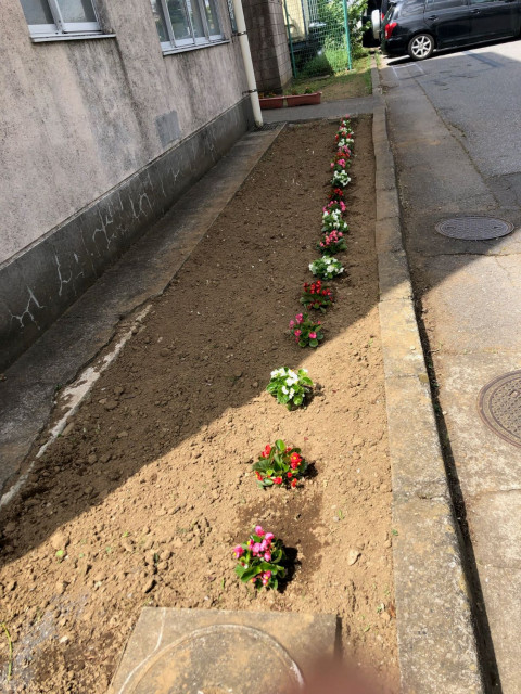 3,4年生の保護者の方が中心となり、八木原小学校の広い花壇の草取り、花植えが行われました。
