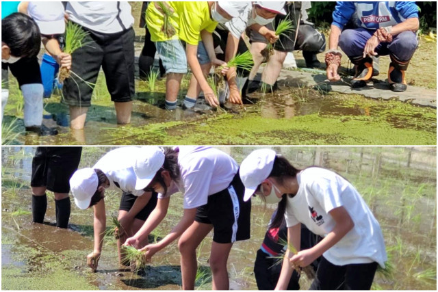 自分達で代かきをして平らにした田んぼにいよいよ苗を植えていきます