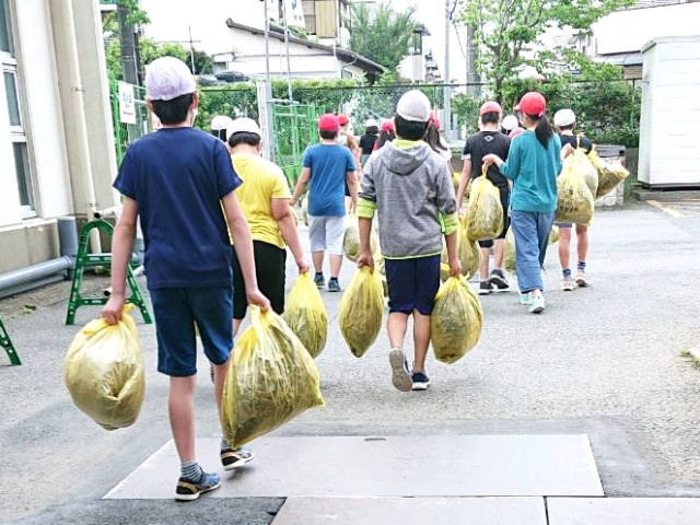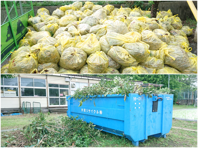 PTA役員は剪定した枝をコンテナに運び、草をゴミ袋に詰め回収していきます
