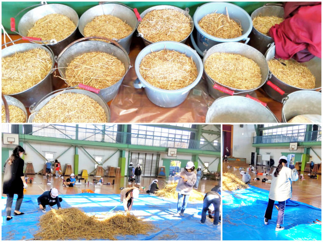 子供達、先生方、ボランティアさん皆が藁まみれになって頑張りました