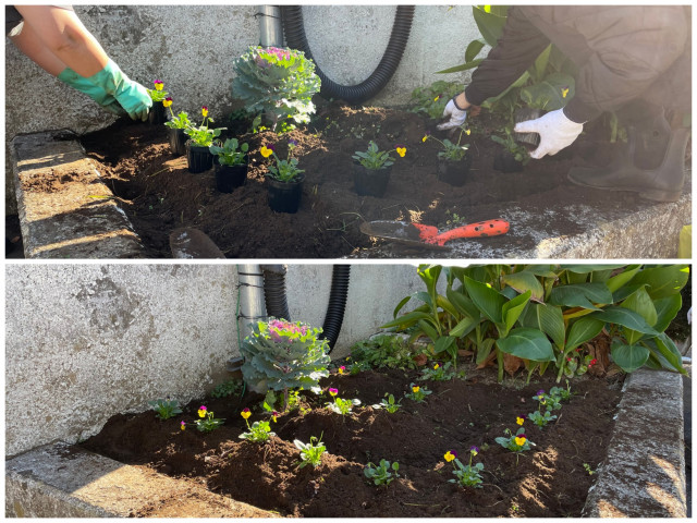 今回植え替えをした花壇は子供達が登下校で必ず目にする校舎前とさくら門の前の作業でした