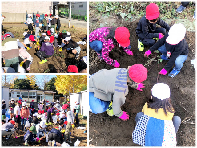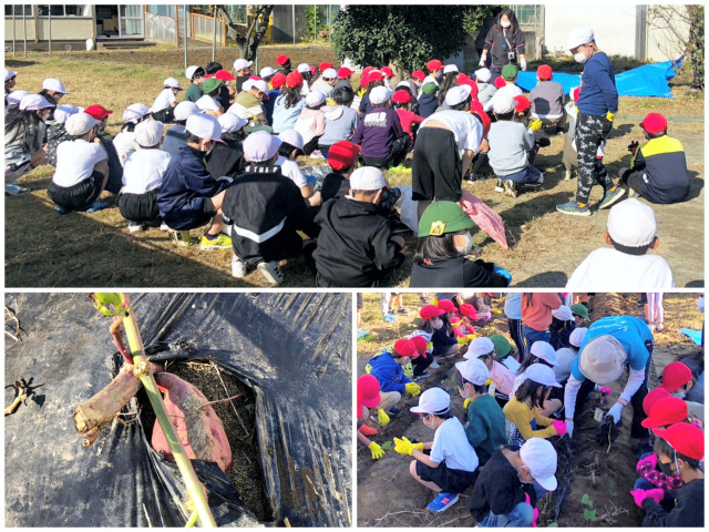校長先生は子どもたちがお芋を掘る姿を見ながら「工事中で砂場が使えずに1年生が楽しく遊べる場が少なくなっている。こうして土に触れる体験はとても良いことですよね。」と話していました