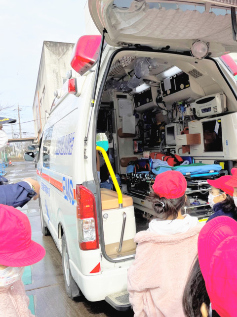 消防隊員の方と元気な挨拶をした後、救急車と消防車の見学をしました